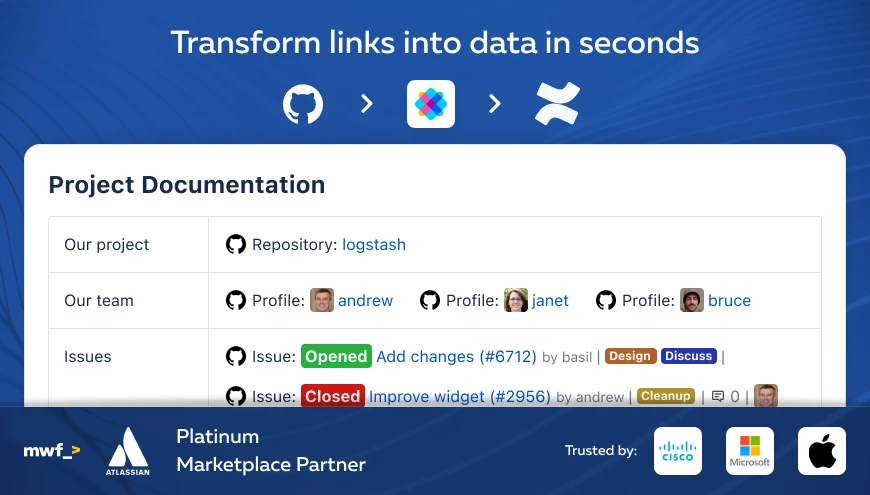 Explore our GitHub integrations: GitHub Links for Jira to track PRs and commits in Jira issues, GitHub Links for Confluence to embed GitHub data in your documentation, and Jigit for teams that use GitHub alongside GitLab or Azure DevOps.