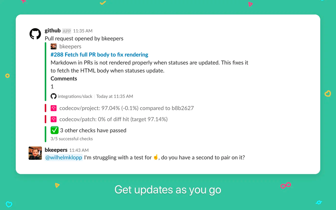 This is one of the top integrations for Github users, you can easily bring your code to the conversations you care about with the GitHub and Slack app. With two of your most important workspaces connected, you'll get updates about what's happening on GitHub-without leaving Slack.