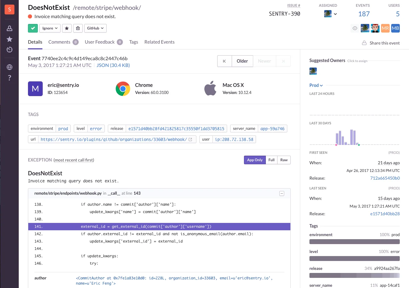 Sentry doesn't just alert you to errors but integrates into your GitHub development flow by linking errors to the commit and author likely responsible, creating new GitHub Issues, and resolving errors with a commit message.