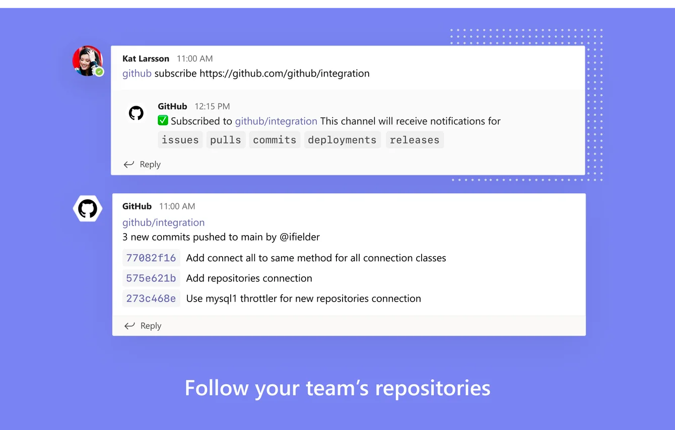 Another amazing integration that helps you keep track of all your team's activities on GitHub and brings them into the conversations you care about is the Microsoft Teams For GitHub Integration.