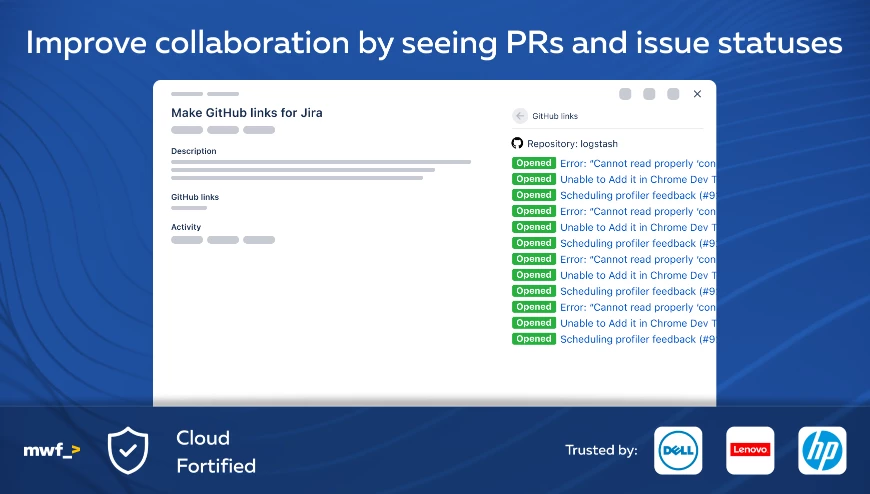 This integration merges the extensive project management of Jira with Github and helps your team view GitHub pull requests and issue statuses in Jira for improved collaboration, efficiency, and monitoring.