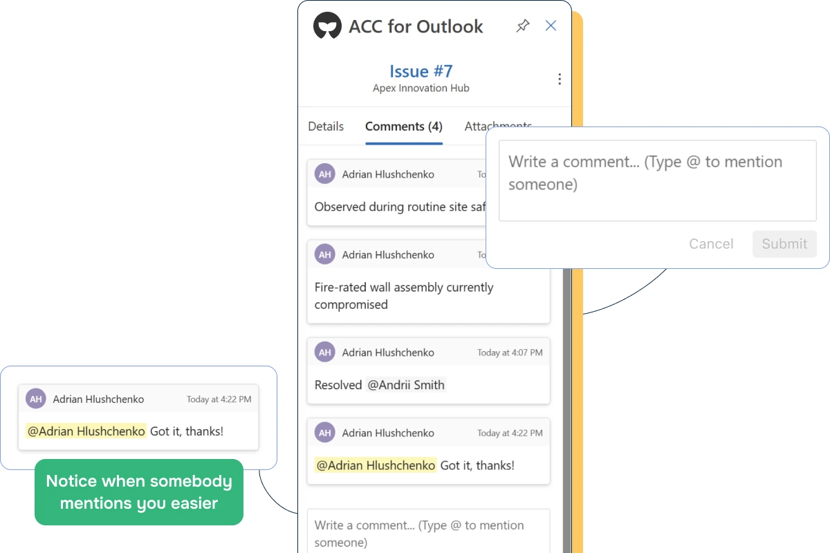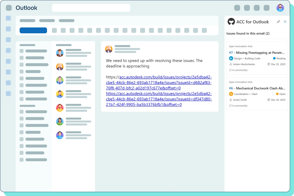 Construction teams manage hundreds of issues across complex projects, yet the tools they use to track those issues and the tools they use to communicate about them remain disconnected. Project managers, engineers, and field teams routinely switch between Outlook and Autodesk Construction Cloud to check issue status, update assignments, or respond to notifications - a workflow that slows response times and creates communication gaps.