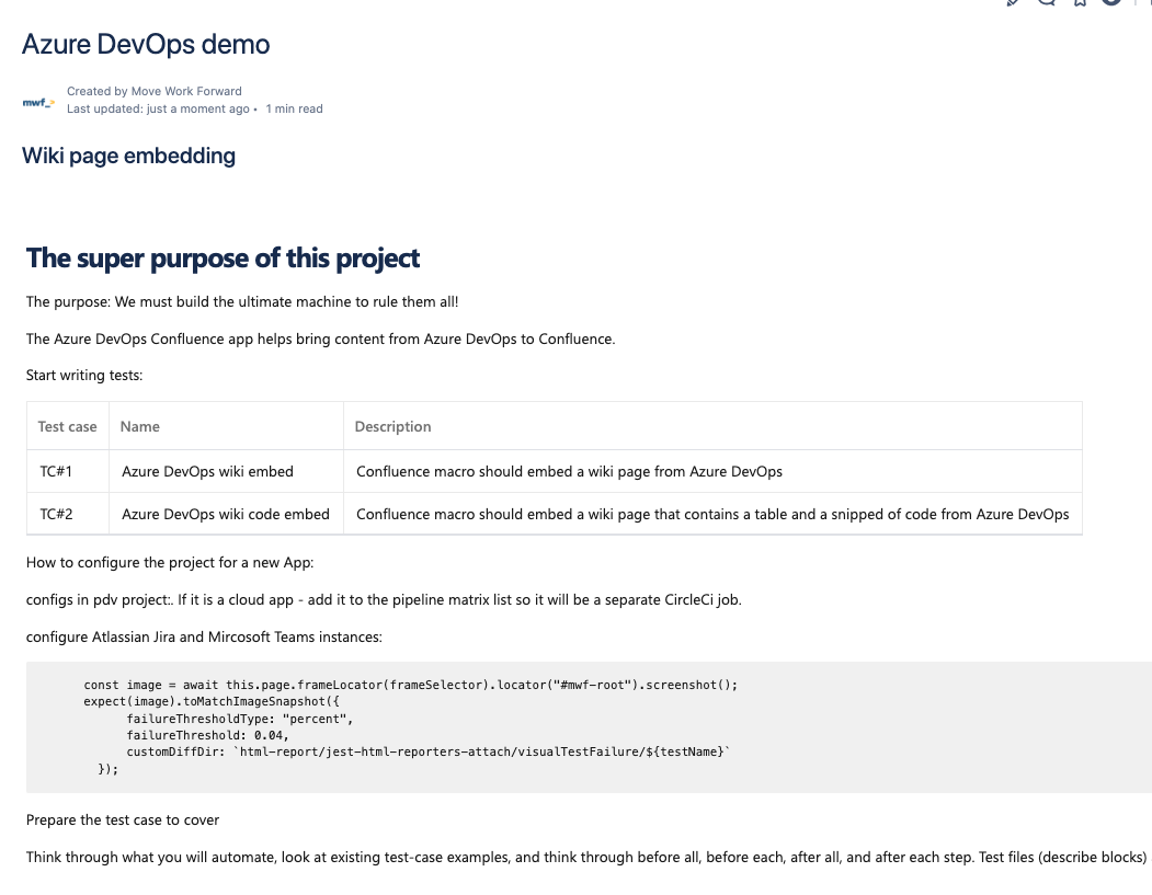 On top of that, also Azure DevOps work items and saved search queries are also supported by Azure DevOps Connector for Confluence from Move Work Forward.