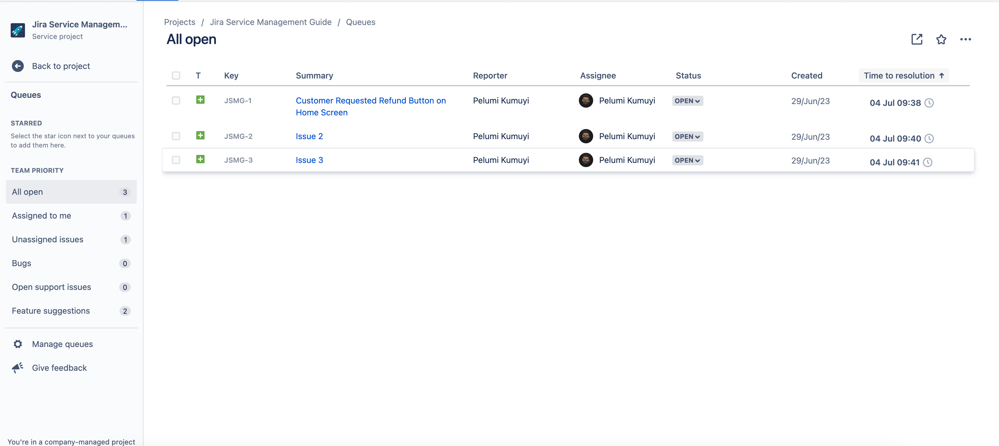 In this sample, we used a customer service project template and then created some issues (see below)